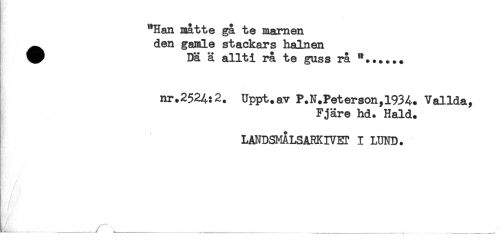 //// "Han måtte gå te manien //// ^ den gamle stackars halnen //// ^ Dä ä allti rå te guss rå //// - //// nr.2524,:2. Uppt.av P.N.Peterson,1934. Valida, //// Fjäre hd. Hald. //// LANDSMALSARKIVET I LUND. //// /. //// t- ////