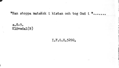 //// "Han stoppa matsäck i kistan och tog Gud i *....... //// A //// s.8-9. ! //// Klövedal(B) : //// t ^ //// i //// i //// 1.F.G.H.5292. //// L //// F //// e //// t- //// S //// i //// ! //// j! //// i ////