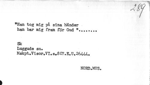 //// "Han tog mig på sina händer //// han bar mig fram för Gud *........ //// t //// < //// i //// i //// < //// Sk //// Luggude sn. //// Mskpt.Visor.VI.s.807.E.U.26444. //// i ////