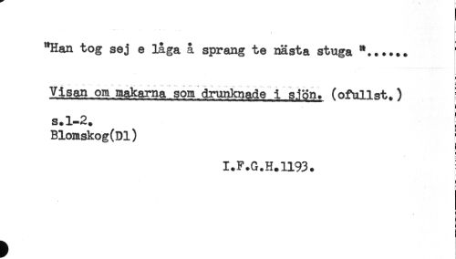 //// r //// t * //// "Han tog sej e låga å sprang te nästa stuga //// * //// Visan om makarna som drunknade i s.13n. (ofnllst.) //// i //// s.1-2. ; //// Blomskog(Dl) ' //// i //// I.F.G.H.1193. //// < ////
