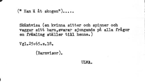 //// (" Han ä åt skogen")..... ! //// ! //// ! //// Skämtvisa (en kvinna sitter och spinner och //// vaggar sitt barn,svarar sjungande på alla frågor //// en främling ställer tiH henne.) //// Vgl.25:65.s.l8. //// (Barnvisor). //// < //// UIMA. ////