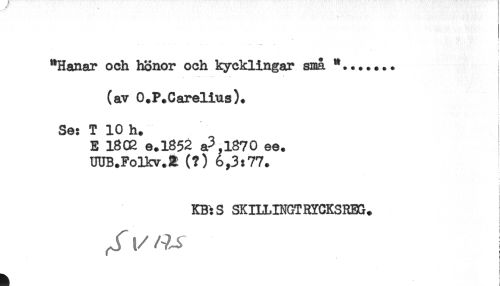 //// - . - .— //// "Hanar och honor och kycklingar sna *....... //// —. ... \ //// (av O.P.Carelius). //// Se: T 10 h. //// E 1802 e.1852 a3,l870 ee. //// UUB.FoUrv.2 (?) 6,3:77. //// ! //// KB:S SK ILL BETRYCKS REG. //// ^ ^ i //// < ////