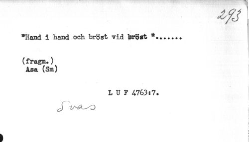 //// "Hand i hand och bröst vid bröst *....... //// (fragm*) //// Asa (Sm) //// - //// * ! //// L U F A763:7. //// r //// ! ////