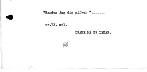 //// ^^ "Handen jag dig gifver "... + ..+ //// nr.72. mel. //// DRAKE MS KB LEKAR. //// . //// t //// L___ __.......... ..... —------ . — ////