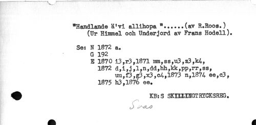 //// < //// - //// "Handlande ä'vi allihopa "......(av R.Roos.) //// (Ur Himmel och Underjord av Frans Hodell). //// Se: N 1872 a. //// G 192 //// E 1870 i3,r3,l871 mm,ss,u3,z3,kA, //// 1872 d,i,j,l,n,dd,hh,kk,pp,rr,ss, //// uu,f3,g3,x3,cA,l873 n,l87A ee,c3, //// 1875 h3,l876 ee. //// ^ KB: S SKIEEINGTRYCK3RBG. ////