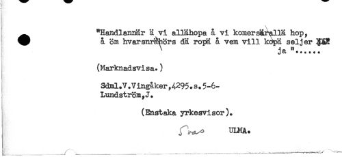 //// < //// } //// ) //// I ^ "Handlannär a vi allahopa å vi komersäralla hop, //// ^ å öm hvarsnråShörs dä ropä å vem vill k^pä sel jer ^ //// J //// (Marknadsvisa.) //// , Sdml.V. Vingåker,4295. s. 5-6- //// Lundström,J. //// (Enstaka yrkesvisor). //// ULH&. //// [ _ _ __' .____ ___,____------- . ////
