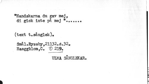 //// "Handskarna, du gav mej, //// di gick inte på mej *..*.... //// (text t.sånglek). //// Smål.Ryssby,21132. é.32. //// Haeggblom,C. 219. //// ULMA SANGLEKAR. ////