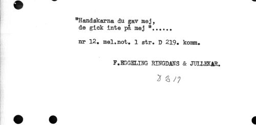 //// "Handskarna du gav mej, //// de gick inte på mej *...... //// nr 12. mel.not. 1 str. D 219. komm. //// F.EGGELING RINGDANS & JULLEKAR. ////