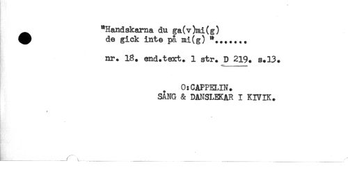 //// "Handskarna du ga(v)mi(g) //// ^ de gick inte på mi(g) //// r //// nr. 18. end.text. 1 str. D 219. s.13. //// . 0:CAFPELIN. //// SÄNG & DANSLEKAR I KIVIK. //// _____ ^ _ _ ______ _____ ___ ////