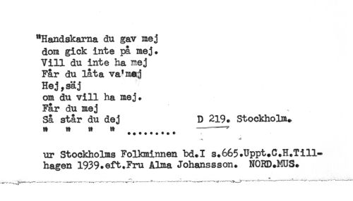 //// "Handskarna du gav mej //// dom gick inte på mej. //// Vill du inte ha nej //// Får du låta va'narj //// Hej,säj //// om du vill ha mej. //// Får du mej //// Så står du dej D 219. Stockholm. //// a tt t* & —- //// j. //// ur Stockholms Folkminnen M.I s.665.Uppt.C.H.Tlll- //// hagen 1939. eft. Fru Alma Johanssson. NOKD.MUS. //// -------—----—------r,——---^ ----- ////