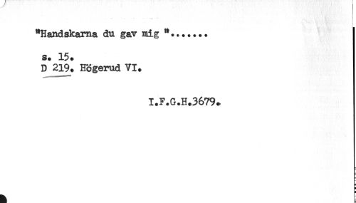//// . — //// "Handskarna du gav mig *....... //// s. 15. //// D 219. Högerud VI. //// I.F.G.H.3679. //// ) //// < ////