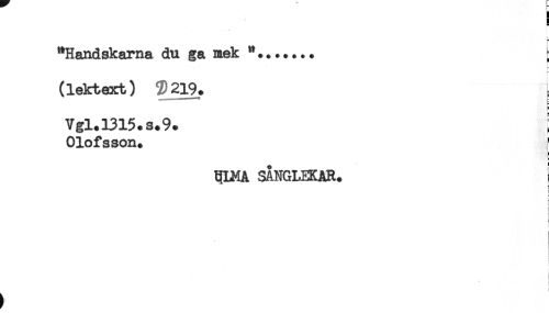 //// "Handskarna du ga mak "....... j //// (lektext) 3) 219. //// Vgl.l315.s.9. //// Olofsson. ! //// ! //// 5 //// QINA SANGLEKAR. i //// - //// < j //// i ////
