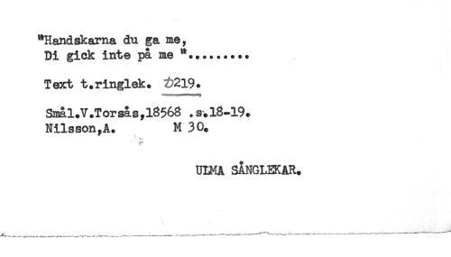 //// "Handskarna du ga me, //// Di gick inte pa me **......... //// Texi t.ringlek. 3219+ //// Smal.V.Torsas,18568 .s+18-19. //// Nilsson,A. M 30. //// '' //// ULMA SANGLEKAR. ////