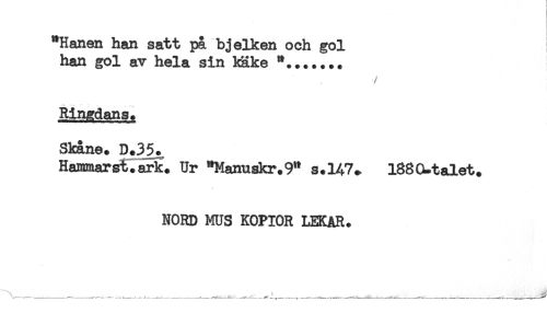 //// "Hanen han satt pa bjelken och gol //// han gol av hela sin käke *....... //// / //// Ringdans. //// Skåne. D.35. //// Hammar st. ark. Ur "Mannar. 9" s.147* 1880-talet. //// NORD MUS KOPIOR LEKAR. ////