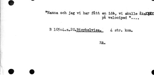//// "Hanna och jag vi har fått en id6, vi skulle åkaXpK //// på velociped *.... //// B 105:4.s.20.Bicykelvisa* A str. kom. //// RA. ////