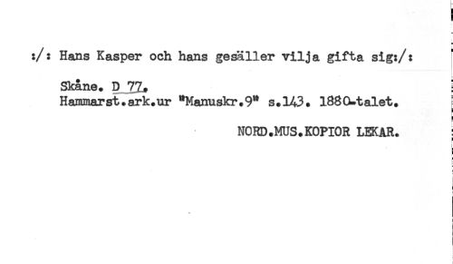 //// c //// :/: Hans Kasper och hans gesäller vilja gifta sig:/: //// Skåne. D 77. } //// Hamaarst.ark.ur *Manaskr.9" s.143. 1380-talet. //// i //// H //// E //// NORD.MUS.KOPIOR LEKAR. : //// I //// ! //// . //// t //// : ////