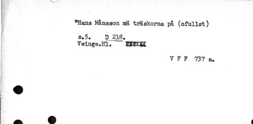 //// "Hans Månsson nä träskorna på (ofallst) //// s.5. D 218. //// Veinge.Hl. BBBOEX //// ; V F F 737 a. ////