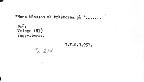 //// "Hans Mansson nä träskoma på //// Veinge (Hl) //// Vaggv.barnv. //// I.F.G.H.957+ //// t //// * //// i //// i ////