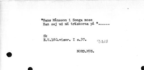 //// "Hans Mansson i Songa mose //// Han sej ud nä träskorna på //// Sk //// E.U.180+visor. I s.37. //// ^ NORD.MUS. ////