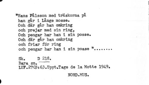 //// "Hans Palsson med träskorna pa ! //// han gar i Lange mosse. //// Och där gar han omkring //// och prejar med sin ring. //// Och pengar har han i sin posse. //// Och där gar han omkring //// och friar för ring //// och pengar har han i sin poase **........ //// Sk. D 21g. //// Bara sn. //// LUT.2703:63.Uppt.T age de la Mötte 1949+ //// NORD.MUS. //// t ////
