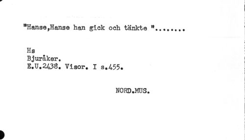 //// *Hanse,Hanse han gick och tänkte //// = //// ! //// Hs //// Bjuråker. } //// E.U.2433. Visor. I s.A55. //// NORD.MUS. //// i //// ! //// i ////