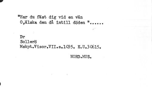 //// "Har du fäst dig vid en vän //// Oyälska den då intill döden "...... //// ! //// ' * //// Dr //// Sollerö //// Mskpt.Visor.VII.s.lC95. E.U.30615. //// NORD .ms. ////