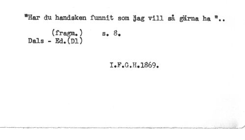 //// "Har du handsken funnit som §ag vill sa gärna ha *.. //// (fragm.) s. //// Dals - Ed.(Dl) //// I.F.G.H.1869. ////