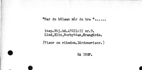 //// J. //// "Har du hälsan nar du bra **...... //// t //// insp.Rtj.bd.47231:11 nr.9. //// Lind,Elin,Norhyttan,Grangärde. //// (Visor om rikedom.lardomsvisor.) //// ^ RA INSP. ////