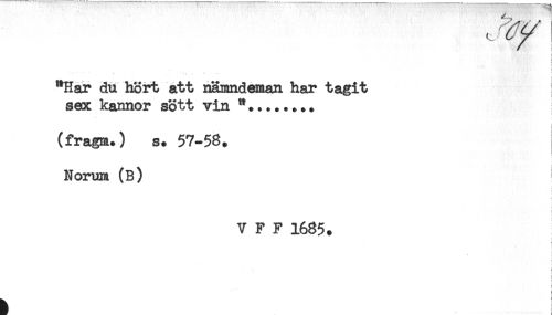 //// ! //// < //// "Har du hört att nämndeman har tagit //// sex kannor sött vin **........ //// < //// (fragm.) s. 57-58. //// Norum (B) //// V F F 1685. //// < //// j //// f //// h ////