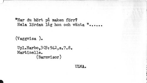 //// "Har du hört på maken förr? //// Hela lördan låg hon och vänta ..... //// < //// t //// ^ //// (Vaggvisa ). //// Upl.Harbo,3C3:%2,s.7*8. //// Martinelie. //// (Barnvisor) //// ULMA. //// b //// H //// H //// § ////