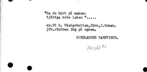 //// "Ha du hört pa maken: //// tjäriga koke lakan //// nr.95 B. Västerbotten,Jörn,J.Boman, //// jfr.: Gubben lag på ugnen. //// NORDLANDER BARNVISOR. ////