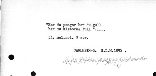 //// '^KrtV''!'* //// ! "Har du pengar har du gull //// har du kistorna full //// j 54. mel.not. 3 str. //// . . //// CARLHEIM-G. S.L.M.1892 . //// v //// A # ////