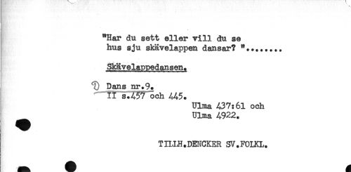 //// - //// - //// "Har du sett eller vill du se //// hus sju skavelappen dansar? //// Skävelappedansen. //// _ //// Dans nr.9. //// .....*TI s:7?röch 445. //// Ulma 437:61 och //// ^ Ulma 4922. //// ! T H.I-H. DENCKER SV.FOLKL. ////