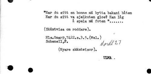 //// "Har du sitt en bonne ma bytta bakani båten //// Har du sitt va sjelkuten gloe? Han Tåg //// å spela ma foten //// (Skämtvisa om roddare). //// [n o //// Hls.Gnarp,7422.s.3.5. (Mel.) //// S.henell,P. //// (Nyare skämtvisor). //// ULMA . ////