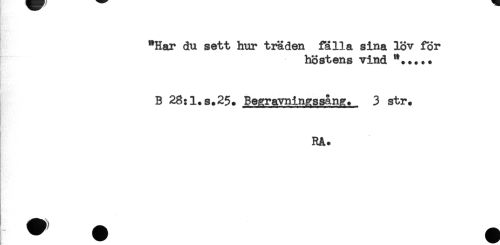 //// "Har du sett hur träden fälla sina lov för //// höstens vind //// B 28:l.s*25. Begravnings sang. 3 str. //// RA. ////