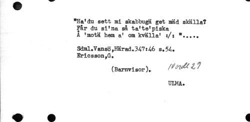 //// "Ha'du sett mi skabbugä get mäd skälla? //// Får du si'na så ta'te'piska //// A 'motä hem a* om kvälla' :/: "..... //// Sdml.Vanso,Härad.347:46 s.54. //// Ericsson,G. //// (Barnvisor). //// ULMA. ////