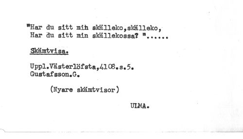 //// "Har du sitt mih gkSllek0,s!<ällek0y //// Har du sitt min skällekossa? "...... //// Skämtvisa. //// Uppl.Västerlöfsta,41ce.s.5. //// Gustafsson.G. //// (Nyare skämtvisor) //// UIMA. ////
