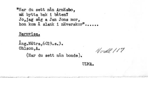 //// "Har du sett nan Amäsho, //// na bytta bak i båten? //// Jo,jag såg a Jan Jons mor, //// hon kom å slank i näverskor**...... //// Barnvisa. //// Ång.Nätra,6019.s.3* //// Ohlson, A. ^ //// (Har du sett nån bonde). //// ULMA. ////