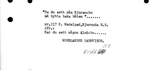 //// "Ha du sett nan Njuran-bo //// ^ ma bytta baka båten *.++.... //// nr.117 C. Medelpad,Njurunda E.S. //// Jfr.: //// Har du sett någon Alno-bo...... //// K'- //// . //// NORDLANDER BARNVISOR. //// - //// ^ - ' ////