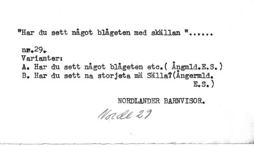 //// "Har du sett något blågeten med skällan *...... //// nB.29+ //// Varianter: //// A* Har du sett något blågeten etc.( Angmld+E.S.) //// B. Har du sett na stor jet a mä Sälla?(Angermld. //// E.S.) //// NORDLANDER BARNVISOR. ////