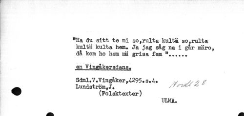 //// "Ha du sitt te mi so,rulta kultaL so.rulta //// kultä kulta hem. Ja jag såg na i gar märo, //// då kom ho hem n8 grisa fem *...... //// en Vingåkersdans. //// Sdml.V.Vingåker,A295.S.4. y - ^ //// ^ Lundström, J. ,, ^ ^ //// ^^ (Polsktexter) //// ULMA. ////