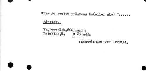 //// "Har du stulit prästens ko(eller sko) ..... //// Sanglek. //// Vb.Burträsk.866l.s.lO. //// Palmblad,V. D 29 add. //// LANDSMÅLSAHKIVET UPPSALA. ////