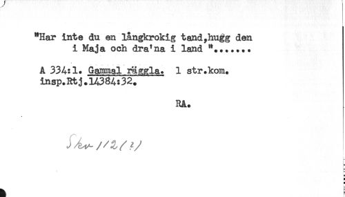 //// "Har inte du en långkrokig tand,hugg den //// i Maja och dra'na i land **....... //// L *: .' * -i -r--. ! //// A 334:1. Gammal rä^gla. 1 str.kom. //// insp.Rtj.14384:32. //// RA. //// * //// t- //// H //// H //// ^ E ////