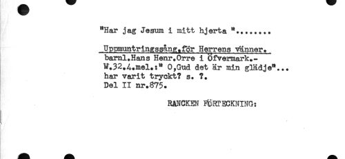 //// "Har jag Jesum i mitt hjerta //// . //// ! //// baml.Hans Henr.Orre i Ofvermark.- //// W.32.^.mel.:" O,Gud det är min gTädje"... //// har varit tryckt? s. ?. //// Del II nr.375. //// RANCKEN FÖRTECKNING: ////