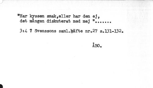//// "Har kyssen smak,eller har den ej, //// det mangen diskuterat med mej "*..*... //// 3:A ? Svenssons saml.^Sfte nr.27 s.131-132. //// ÅBO. ////