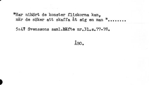 //// "Har nihört de konster flickorna kan, //// när de söker att skaffa åt sig en man **........ //// 5:4? Svenssons saml.Räfte nr.3l.s.77-78. //// ÅBO. //// t ////