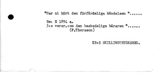 //// "Har ni hört den forfärdeliga handeisen //// Se: E 1894 a. //// 3:e versr.:om den beskedelige Mraren //// (P.Thorsson) //// c* //// KB:S SKIHINGTRYCKSREG. //// - //// ^............. ___ ______ ^ ____- ////