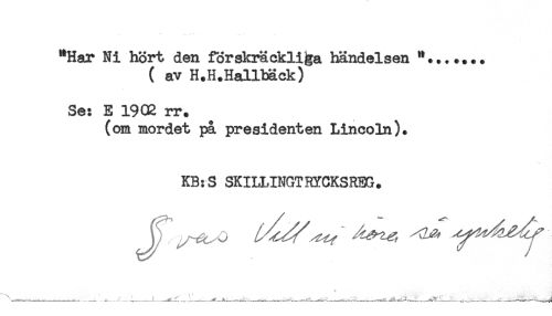 //// "Har Ni hört den förskräckliga händelsen "....... //// ( av H.H.Hallbäck) //// Se: E 1902 rr. //// (om mordet pa presidenten Lincoln). //// KB:S SKILLINGTRYCKSREG. //// t ////