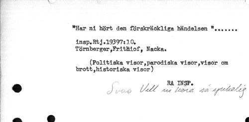 //// "Har ni hört den förskräckliga händelsen *.....+. //// insp.Rtj.19397:10. //// Tömberger,FritRiof, Nacka* //// (Politiska visor,parodiska visor,visor om //// brott,historiska visor) //// ^ RåINSP. . .. //// V' //// f //// t!,' ////