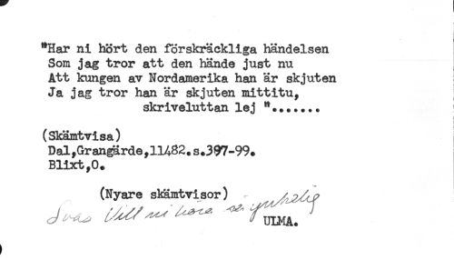 //// "Har ni hört den förskräckliga händelsen //// Som jag tror att den hände just nu //// Att kungen av Nordamerika han är skjuten //// Ja jag tror han är skjuten mitt itu, //// skriveluttan lej "....... //// i //// ! //// (Skämtvisa) //// Dal ,Gr an^rde, 11482. s .397-99. //// Blixt,0. //// (Nyare skämtvisor) r x^j? ////